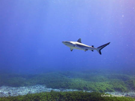 A Silvertip shark (Carcharhinus albimarginatus) swims close by. Across the world, 90% of large fish species, such as sharks, tuna and swordfish have disappeared in the last few decades. Yet, less than 1% of the world’s oceans are fully protected. The seagrass bed here is also an important habitat for many species, including the green turtle.
