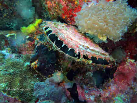 Pinctada sp pearl oyster found in a lagoon in Salomans Atoll. The corals surrounding the oyster are vital in providing a habitat for many different fishes and other marine life.