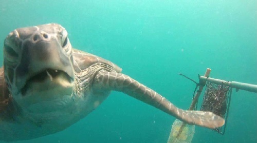 Photo: Video frame of a curious green turtle from underwater video system (c) ZSL/University of Western Australia