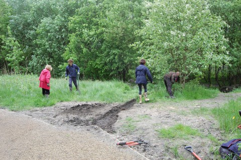 Claudia with other volunteers digging to allow water to flow without obstruction.