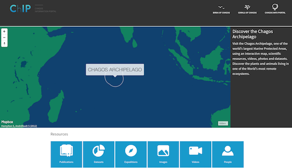 The Chagos Information Portal, known as ChIP, is a reference library of science, research and conservation work conducted in the Chagos Archipelago. ChIP is a user friendly, interactive and open source website, with information on research papers, scientific expedition, photos, videos, and an interactive map.
